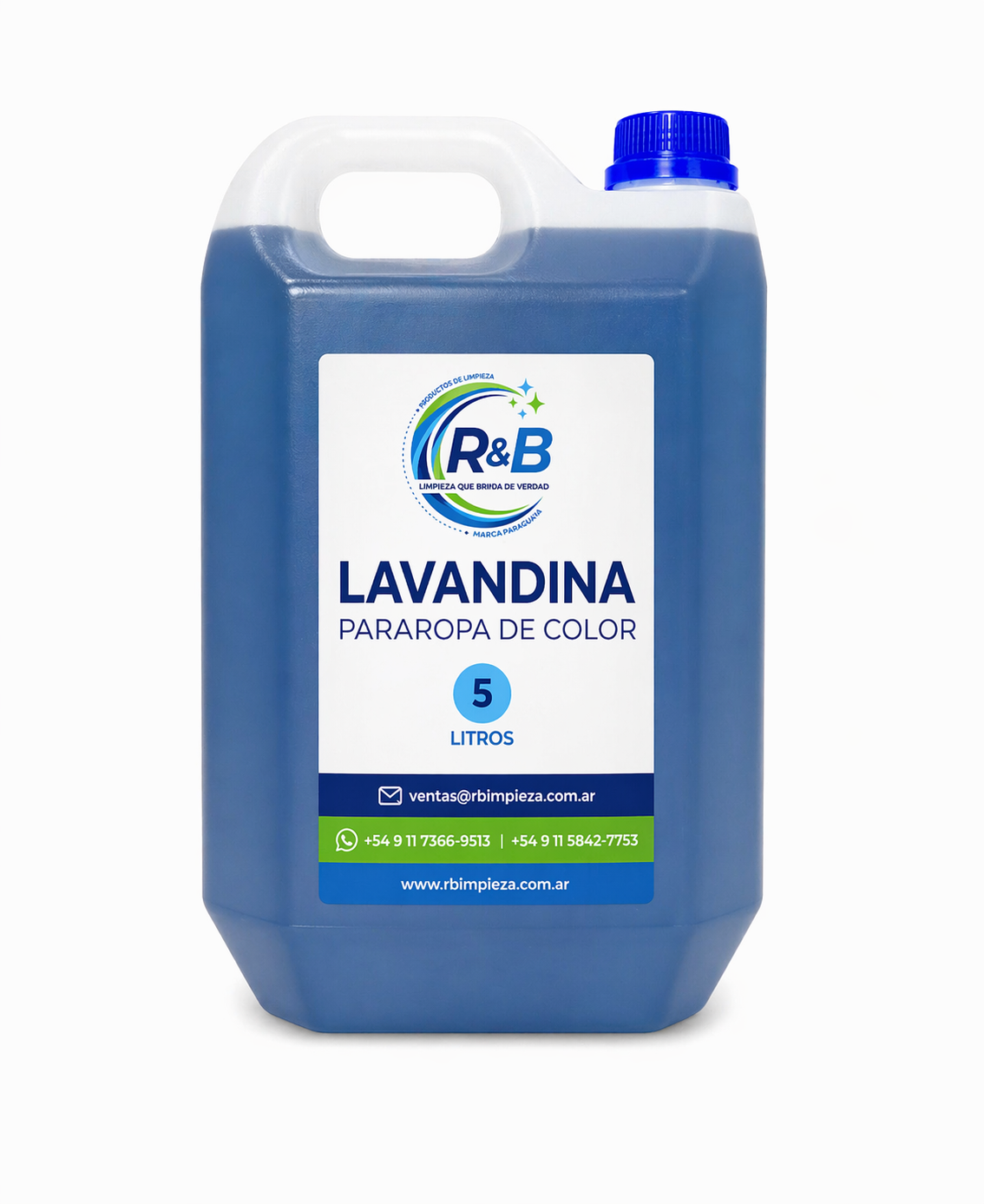 Lavandina para Ropa de Color R&B 5 Litros es un limpiador líquido especialmente formulado para ofrecer máxima higiene y cuidado en prendas de colores, sin dañarlas ni decolorarlas. Su composición actúa como un blanqueador suave y desinfectante, eliminando manchas difíciles, bacterias y olores, mientras preserva la intensidad y brillo original de los tejidos.